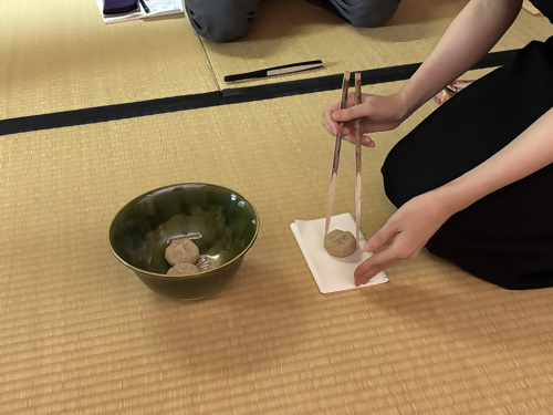 左手を菓子器に添えながら黒文字(くろもじ、茶道用の箸)で懐紙の上にお菓子を取ります。