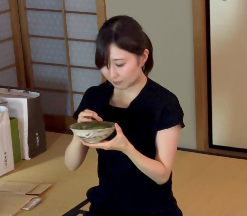 ⑥茶碗を置いて全体の形を拝見し(畳の場合は縁外に置き、両手をついて拝見する)、茶碗を手に取って細部を拝見します。