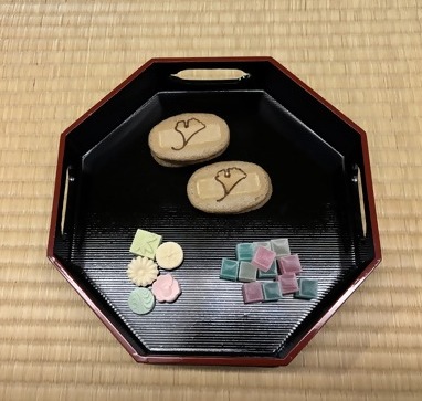 干菓子(真ん中のお菓子は「ふのやき」と呼ばれる裏千家のお菓子で、裏千家に認められた「式亭」というお店でしか販売されていません。)