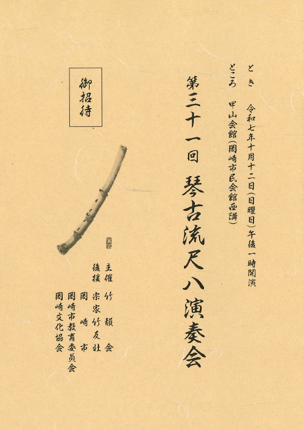 2025.09.22 【会員団体からのお知らせ】『第三十一回 琴古流尺八演奏会』の開催について<竹韻会> 芸能部会 お知らせ イベント 岡崎文化協会会員の「竹韻会」の『第三十一回 琴古流尺八演奏会』が下記の通り開催されます。 皆さまぜひお気軽にご来場ください。 日時 令和7年 10月12日(日) 午後1時開演 場所 甲山会館(岡崎市民会館西隣) 入場料 無料 お問い合わせ 代表 中村 宗州 090-1742-3265 竹韻会会員紹介ページ 尺八 竹韻会 prev. 【会員団体からのお知らせ】『岡崎音楽家協会 第38回 定期演奏会』の開催について<岡崎音楽家協会> カテゴリー category 芸能部会 美術部会 文化部会 新規会員 お知らせ イベント